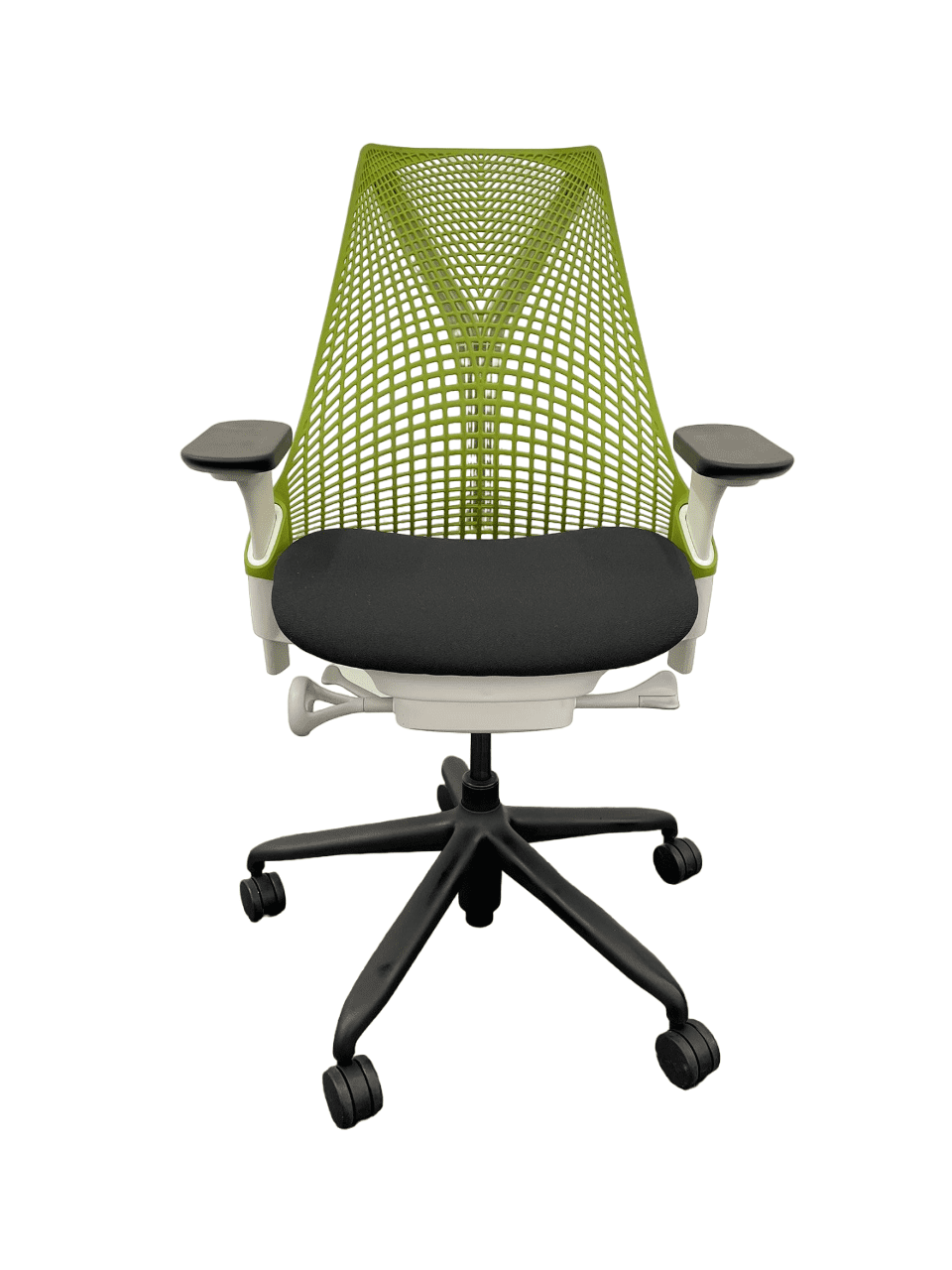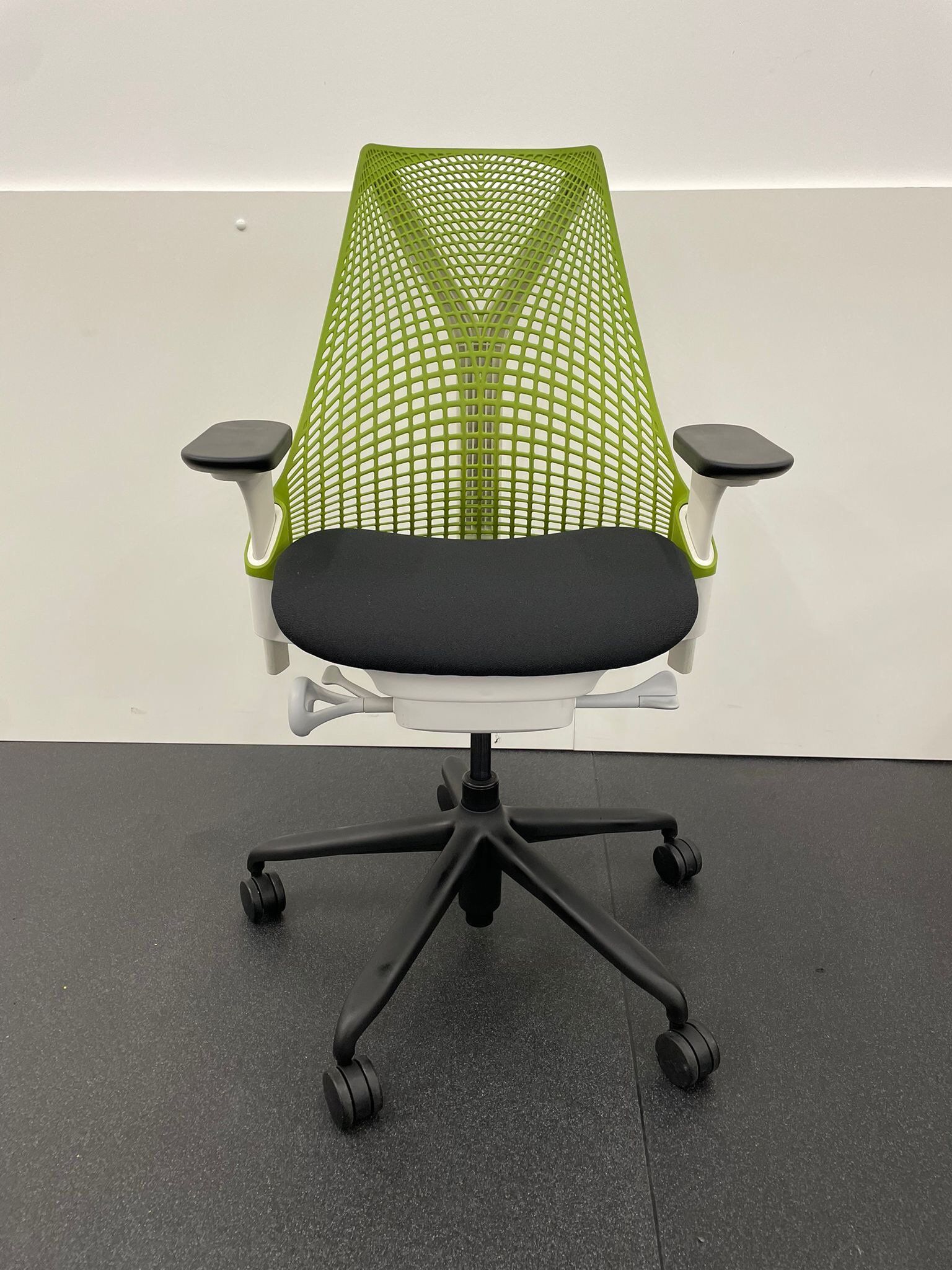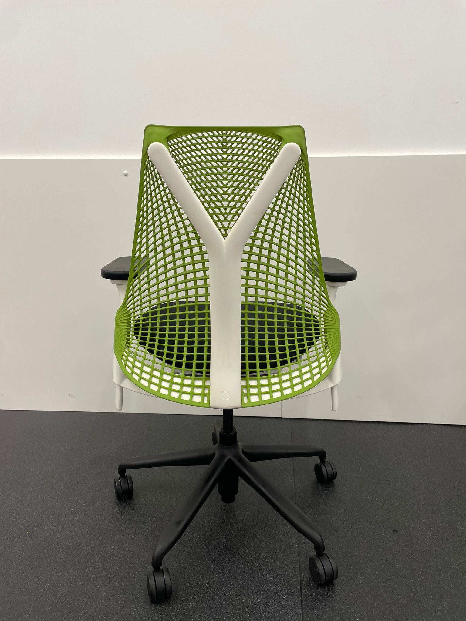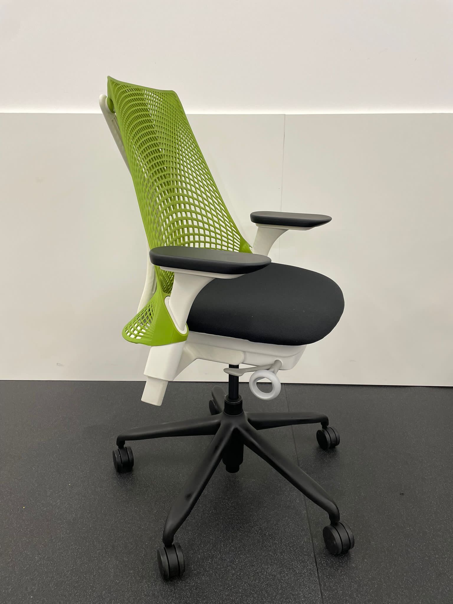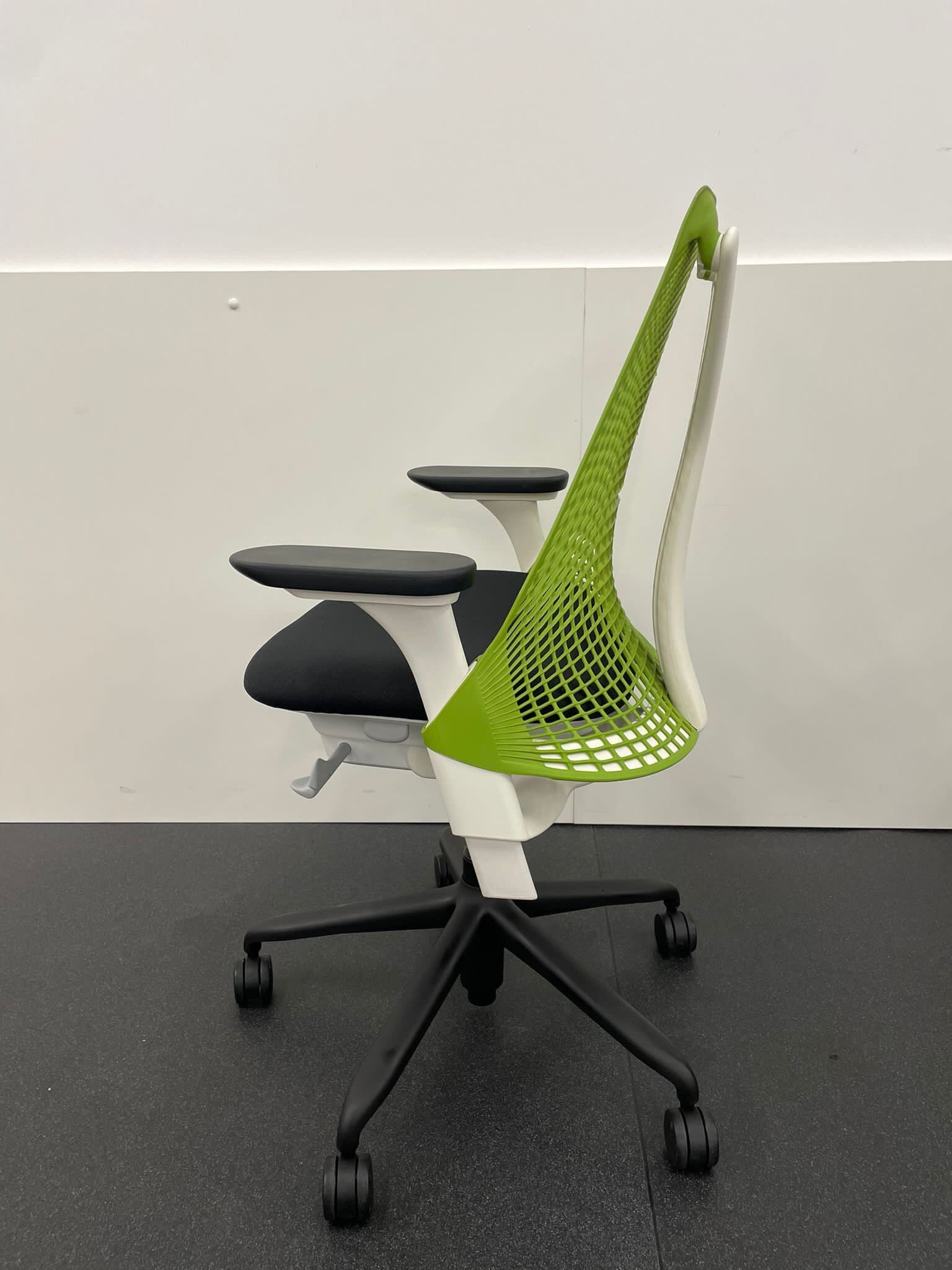 Herman Miller Sayl Task Chair, Green Mesh Back, Black Fabric Seat, White Frame, 3D Arms, Black Base