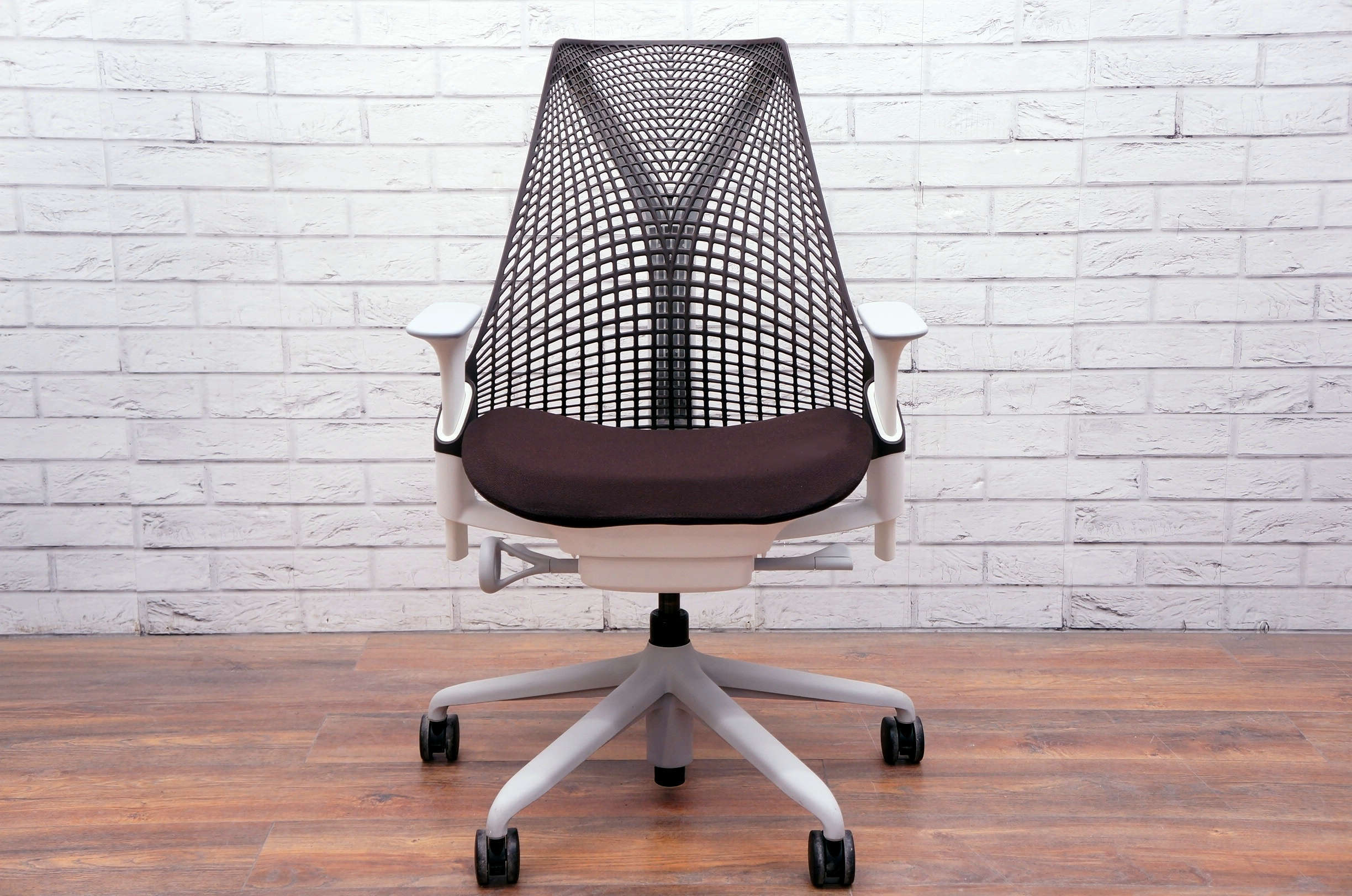 Herman Miller Sayl Task Chair, Brown Mesh Back, Brown Fabric Seat, 2D White Arms, White Frame, Grey Base