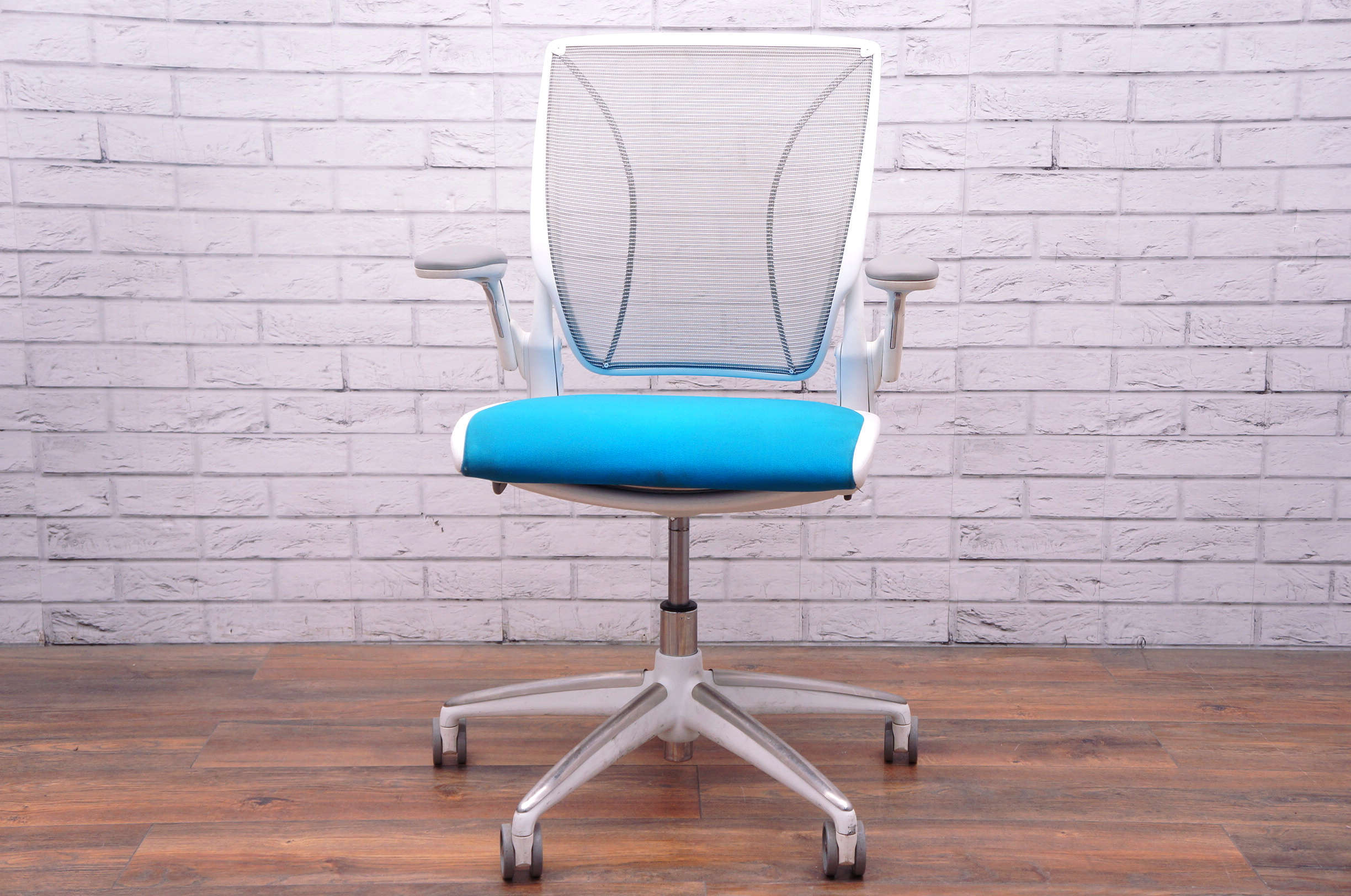 Humanscale Diffrient World Task Chair, Grey Mesh Back, Cyan Fabric Seat, White Frame, Chrome Base