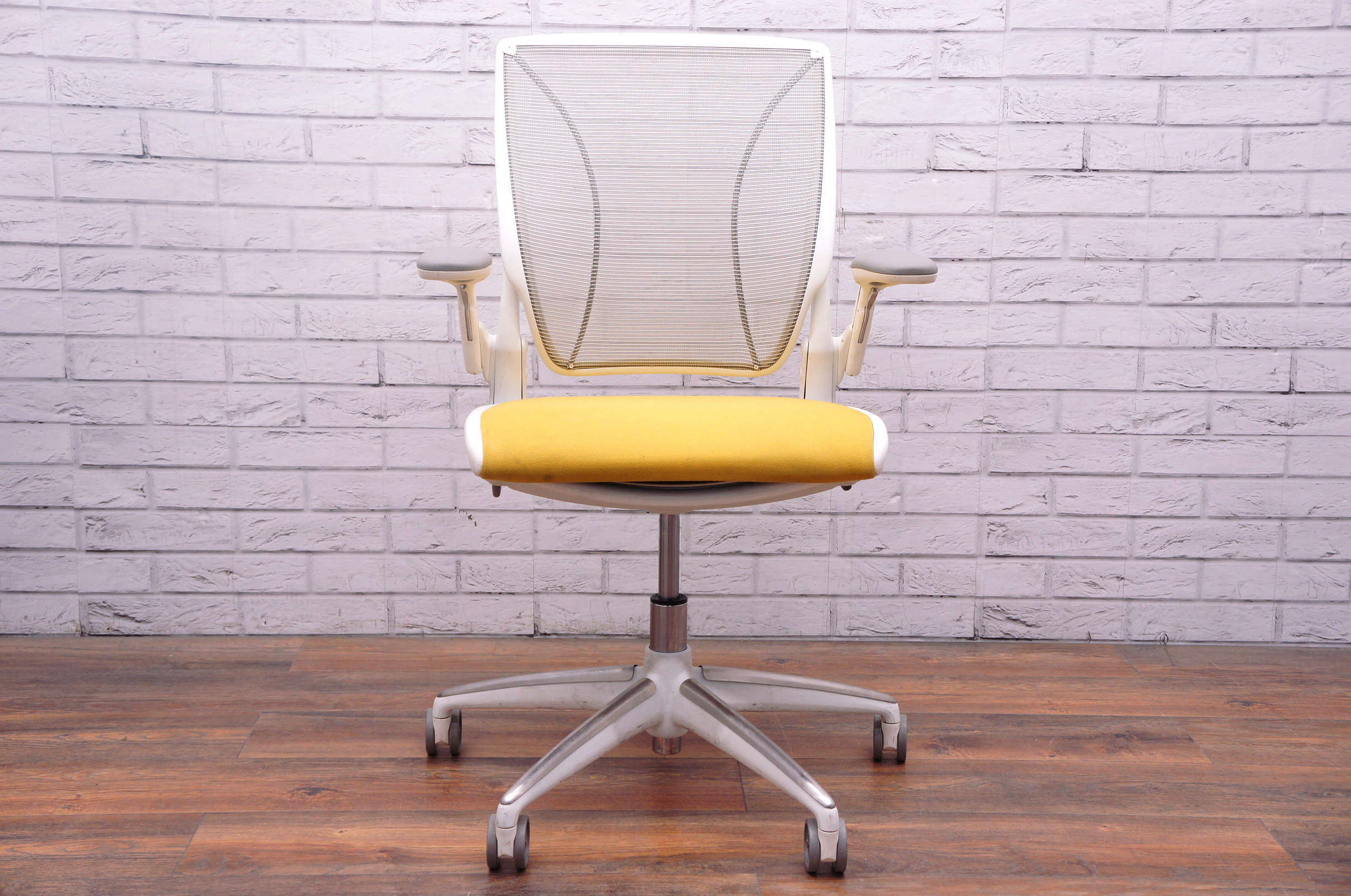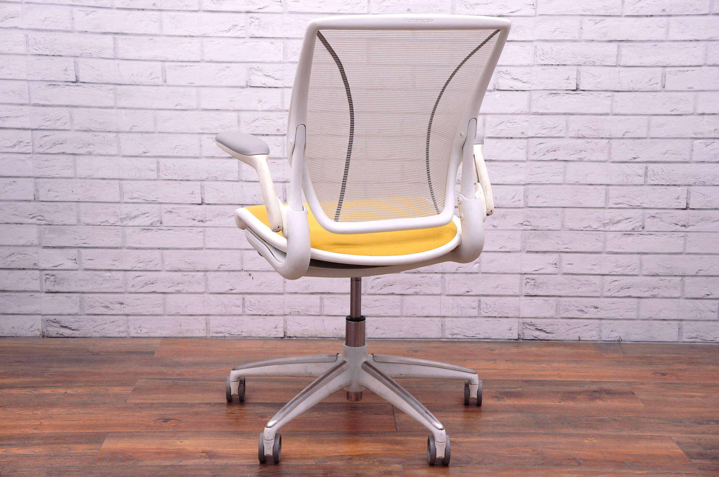 Humanscale Diffrient World Mesh Chair, Grey Mesh Back, Yellow Fabric Seat.