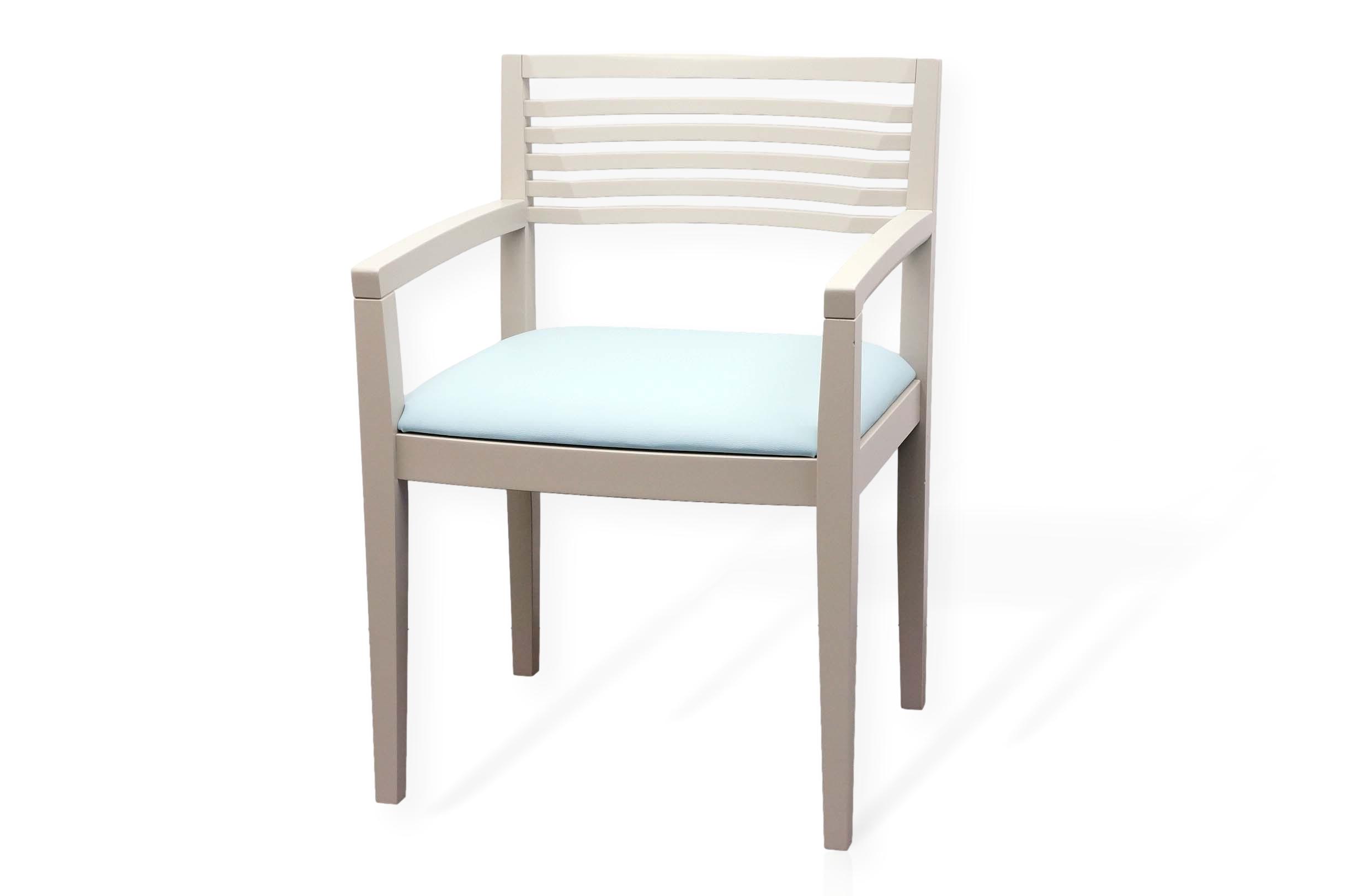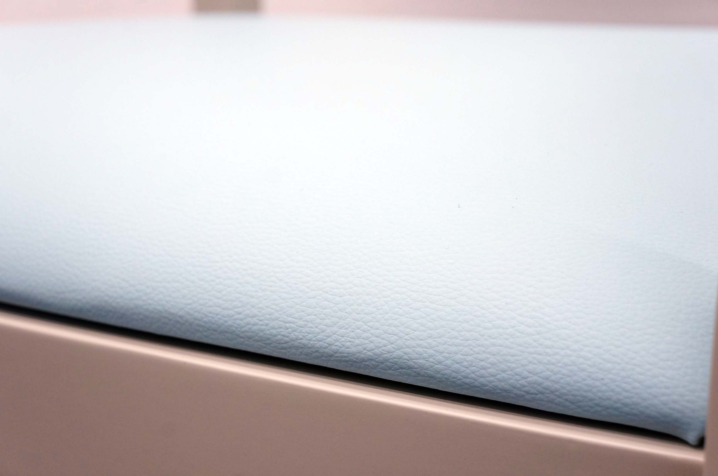 - Newly Upholstered in Agua Fabrics Aeries Faux Leather In Sky
