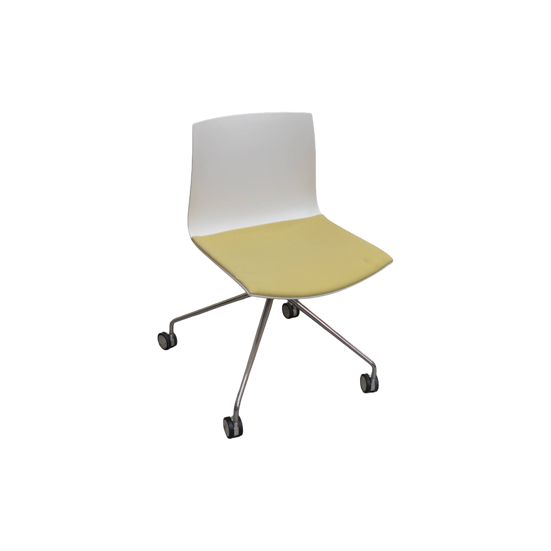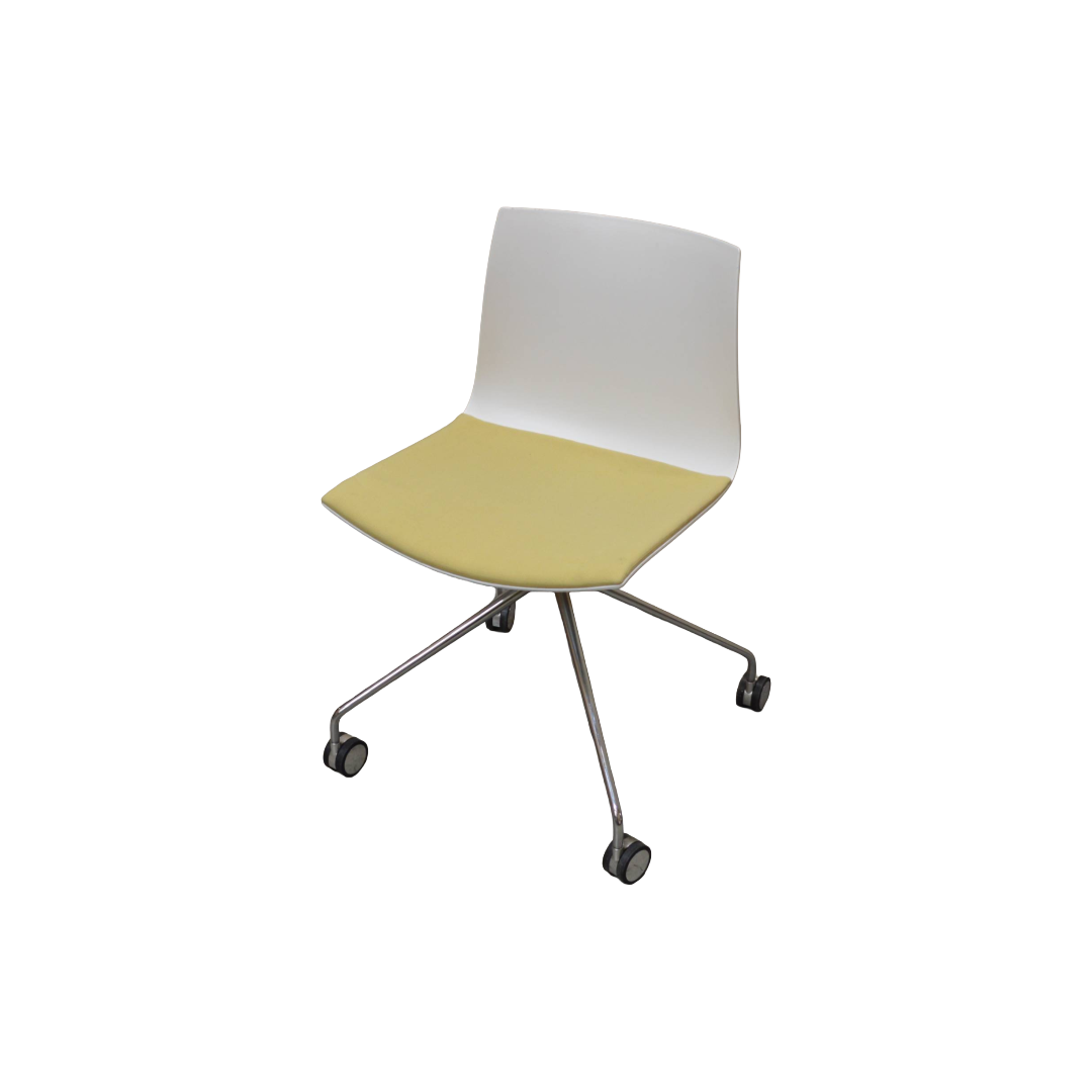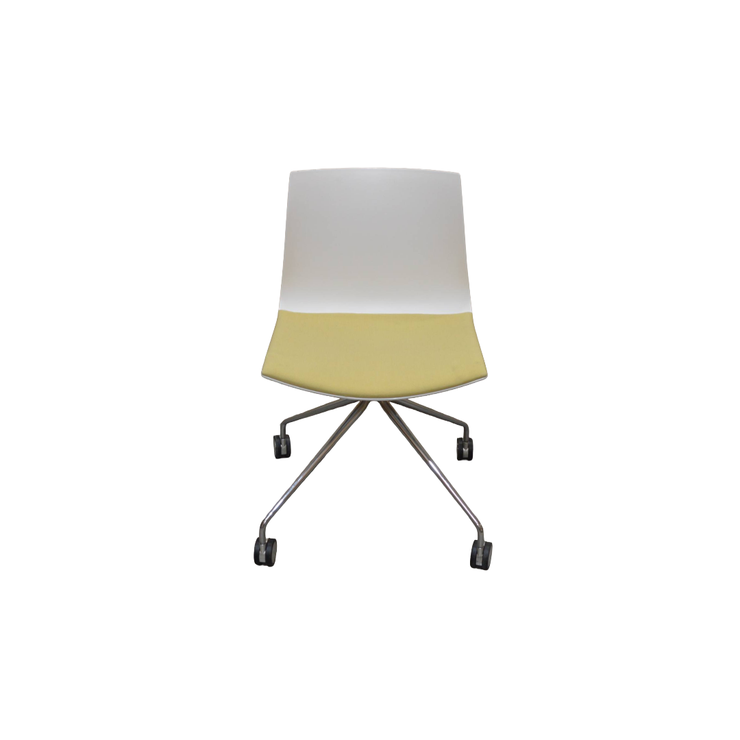 Arper Catifa 46 Chair, White Plastic Back, Yellow Fabric Seat, Chrome Trestle Legs On Castors